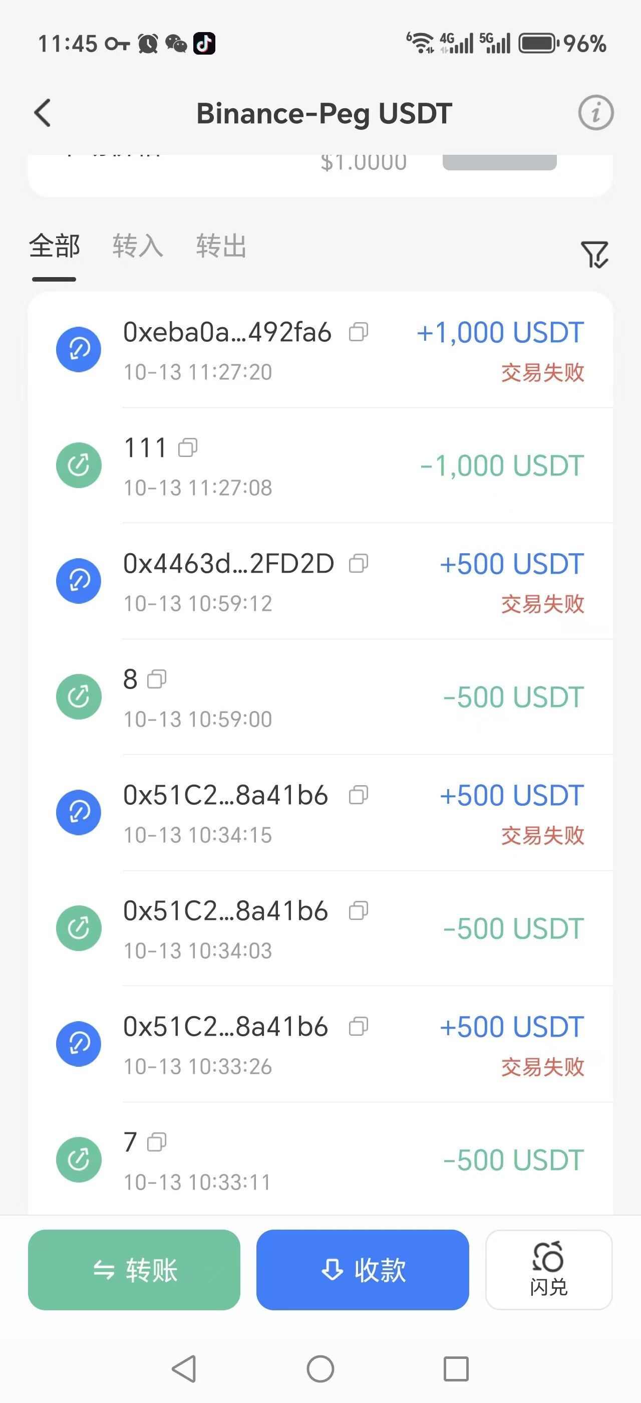 下方图片主账户地址转入到7的地址500油,之后不小心操作又转入500油到上方的交易失败地址里。